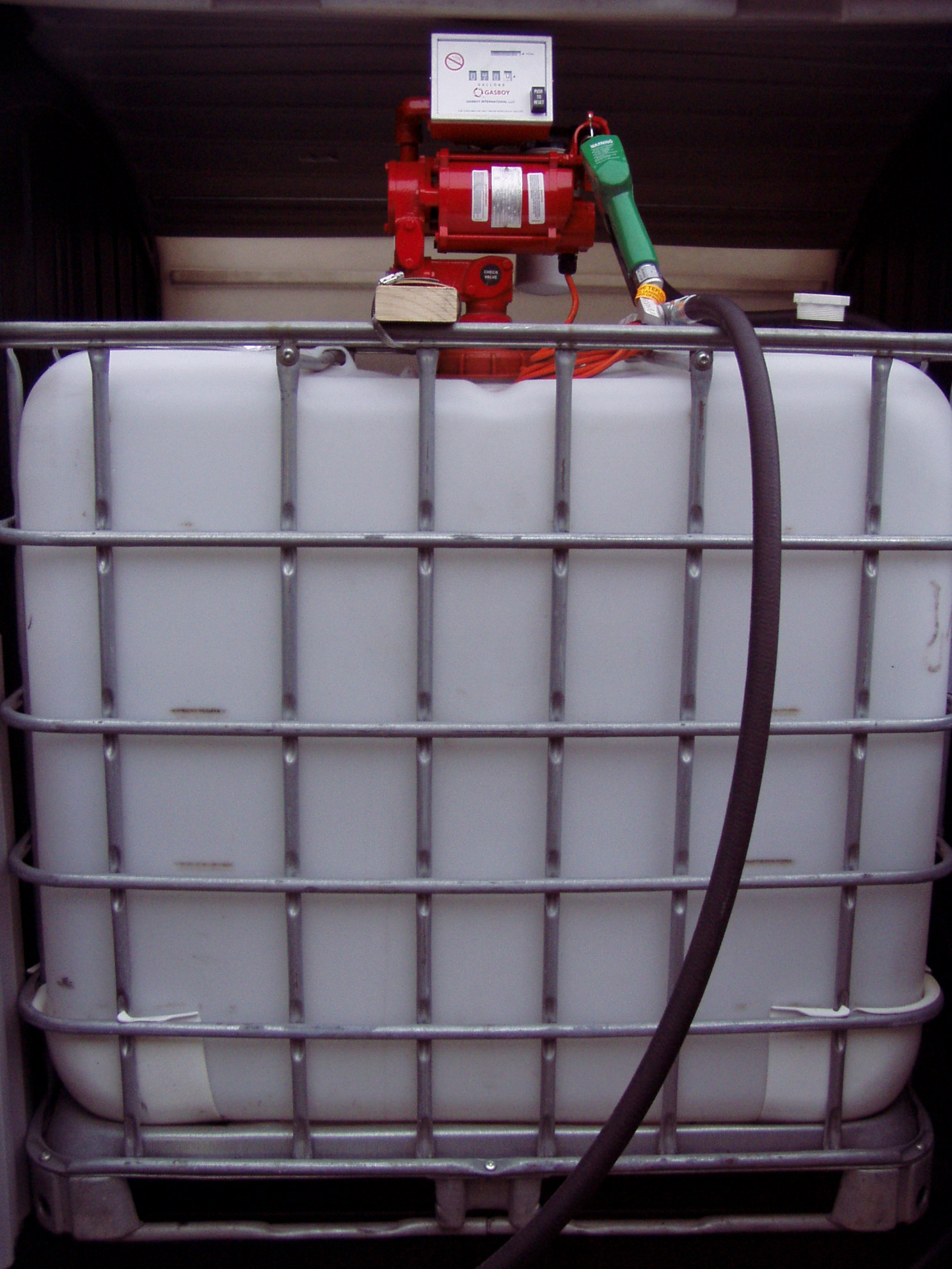 Totes are heavy-duty plastic with galvanized steel reinforcement and are movable with forklift or pallet jack.  Dimensions are 48″x40″ and 46″ tall (without pump)