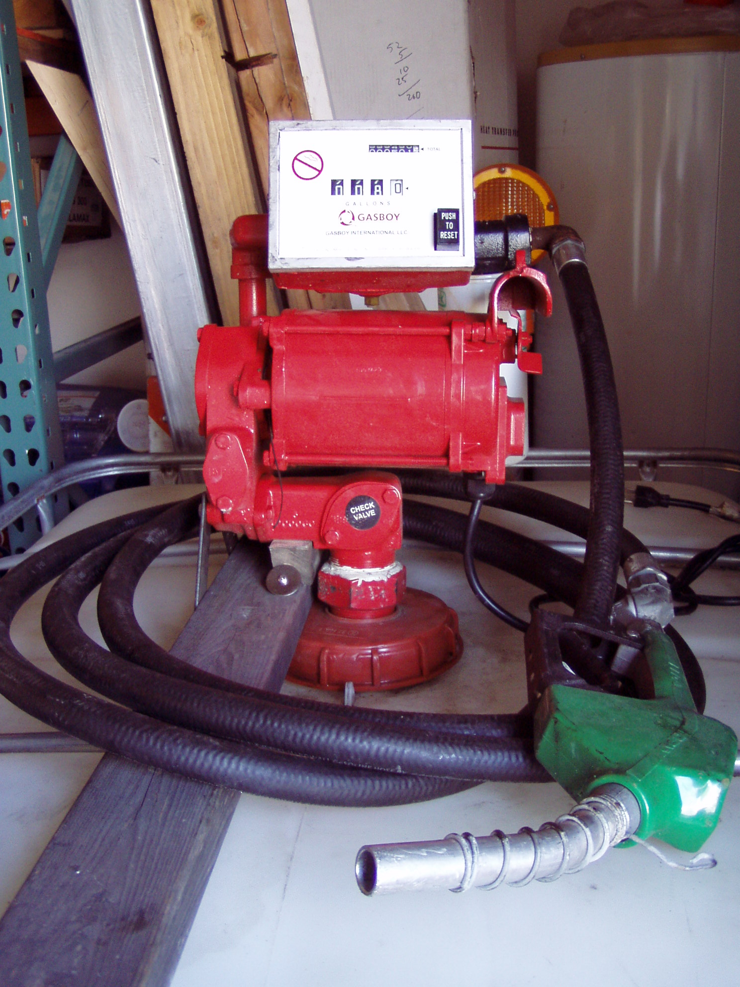 The kit includes electric pump (plugs into standard wall socket) with filter and meter.  You also get plenty of hose and an automatic nozzle — just like you would see at a regular gas station.